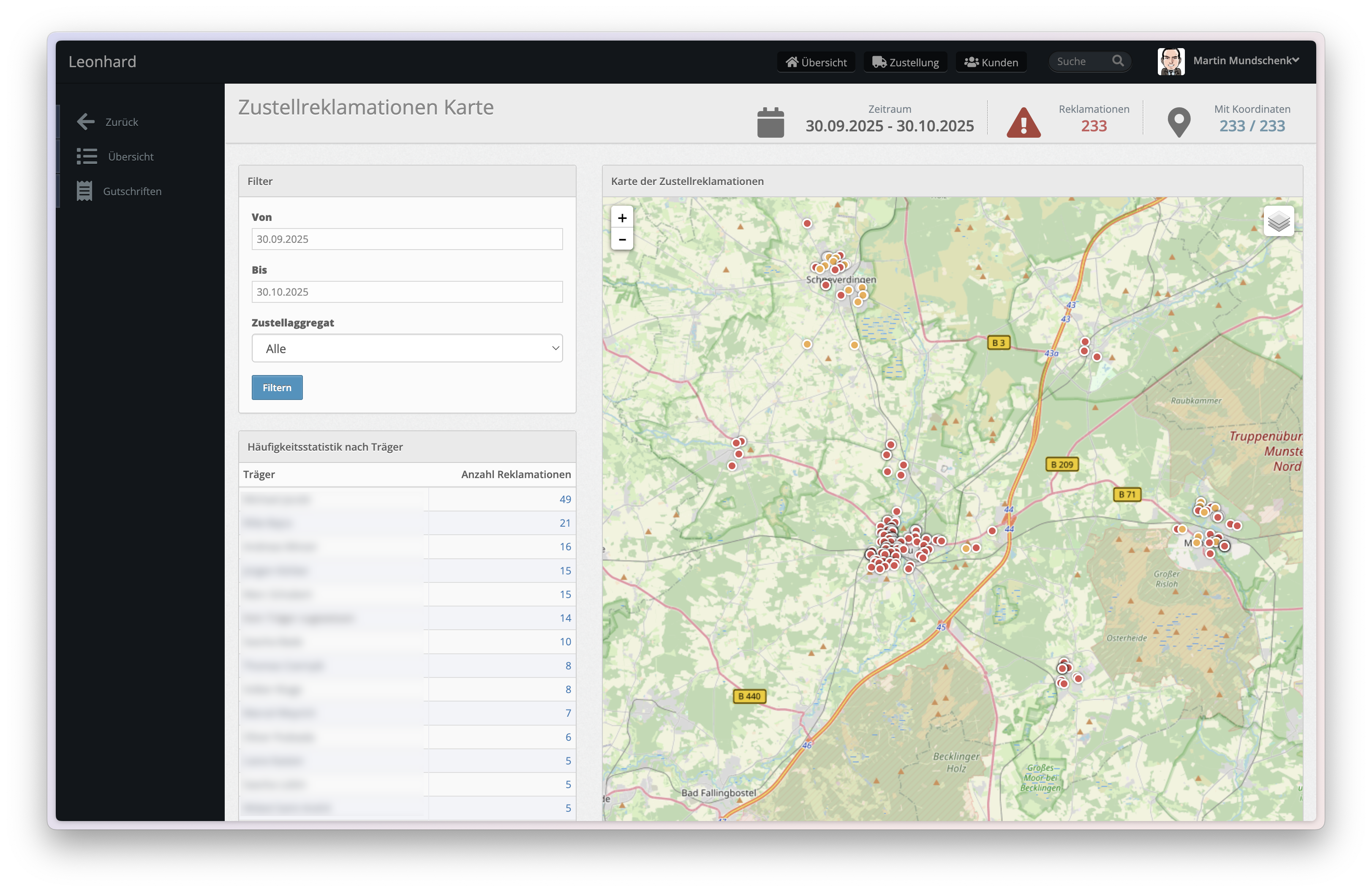 Die Frage ‘Welcher Zusteller hat die meisten Reklamationen?’ ist nur scheinbar einfach. Ein Träger mit 150 Zustellpunkten hat naturgemäß mehr absolute Beschwerden als einer mit 50 Punkten. LEONHARD berechnet deshalb die Reklamationsquote relativ zur Anzahl der Zustellungen.