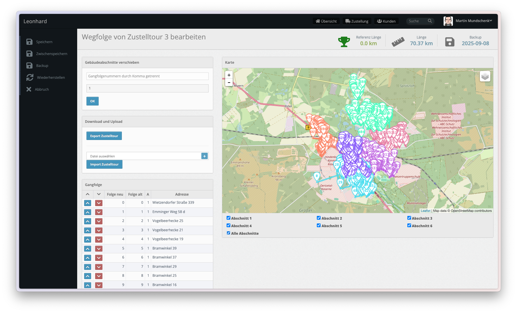 Innerhalb dieser Regionen berechnet LEONHARD den kürzesten Weg, der sämtliche Haushalte verbindet, indem das Traveling Salesman Problem (TSP) gelöst wird. Dieser optimale Gesamtweg wird anschließend nach Ihren individuellen Kriterien in Abschnitte unterteilt.